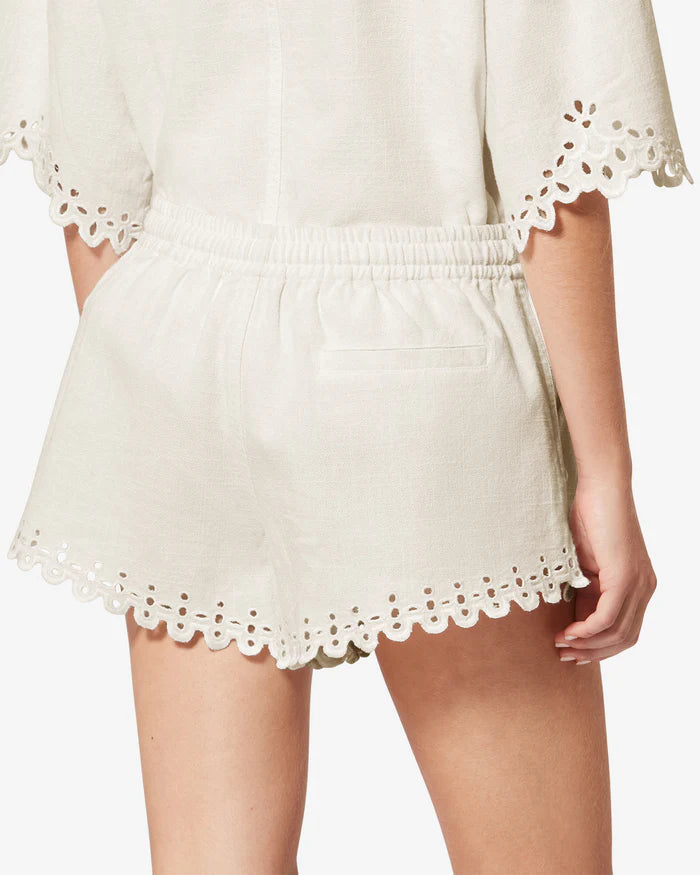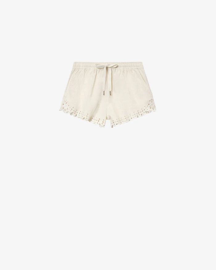Short cotton shorts with openwork embroideryElastic waist with drawstringOpenwork embroidery on the hemsPocket in backRelaxed fit