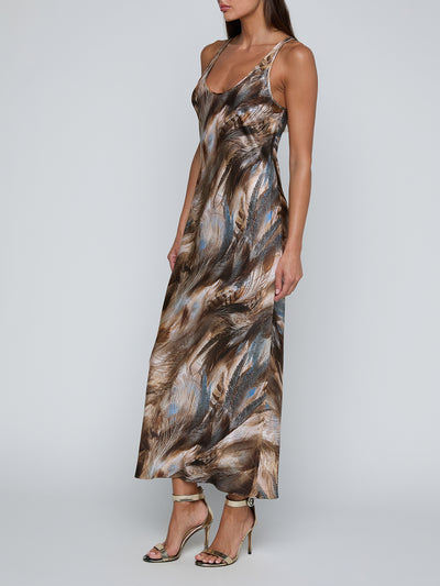 The Akiya tank dress is the definition of day-to-night versatility. Minimal, flattering, and new this season in neutral feather print. Bias-cut satin, deep scoop neck. No closures, popover style.