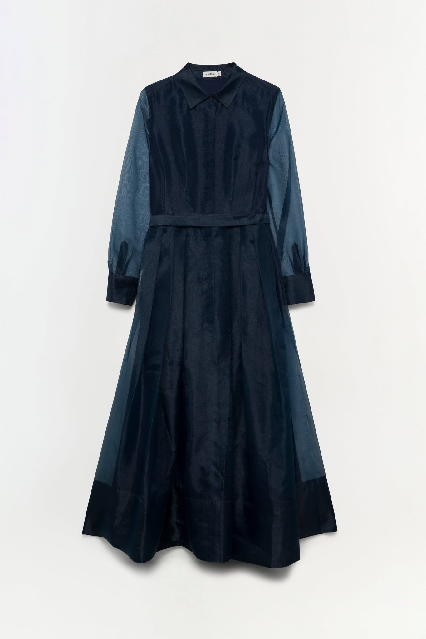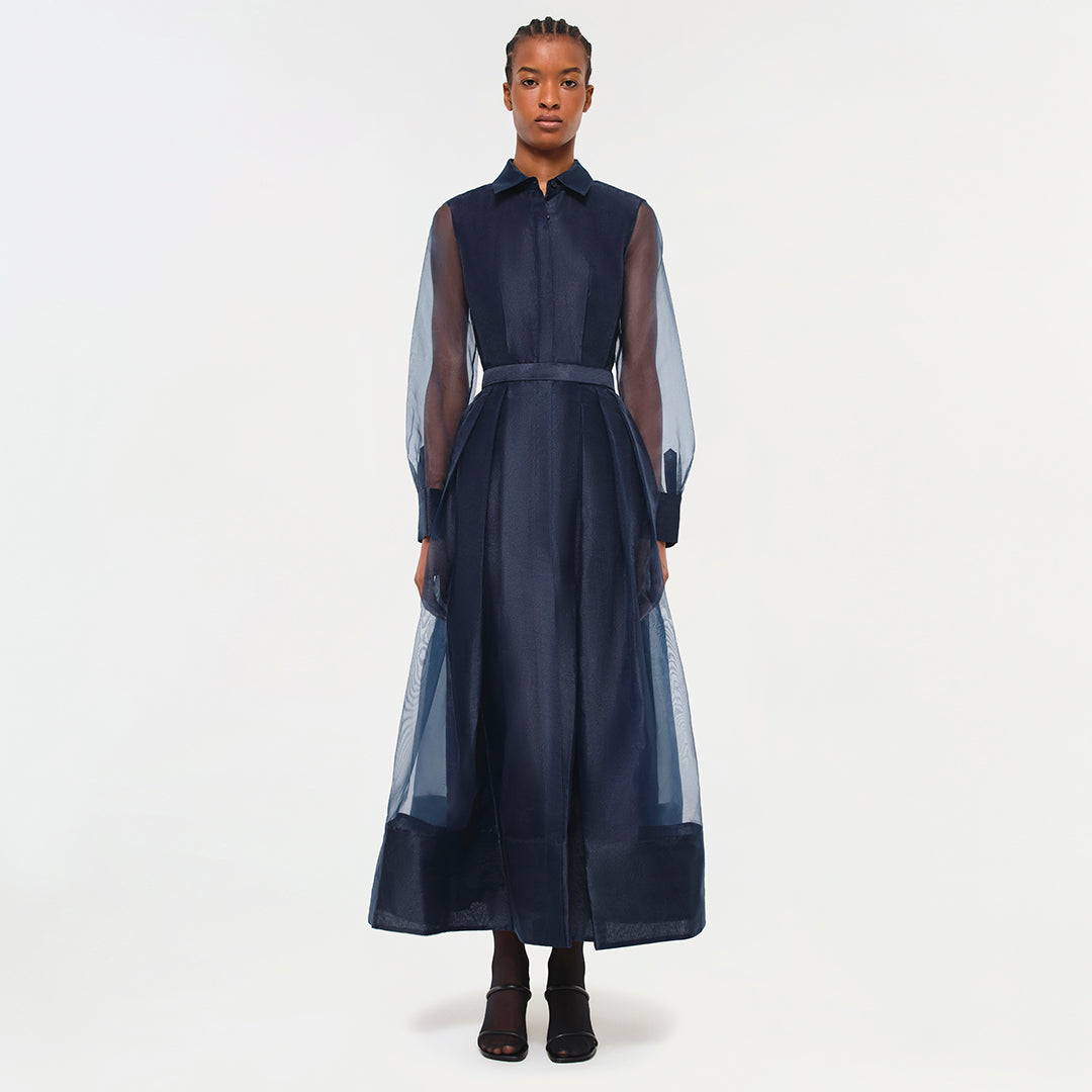 The Montgomery Dress in Midnight. Featuring a long-sleeve, button-up design, this piece extends into a full, midi-length silhouette, offering a structured yet flowing appearance.