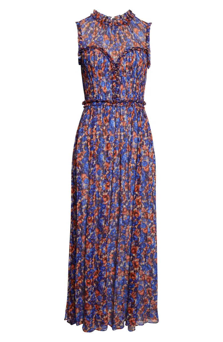 A signature Ulla Johnson silhouette, this multicolored dress is gathered at the bodice and transforms into graceful volume at the hem. Wispy ruffles finish this sunshine-ready dress.
