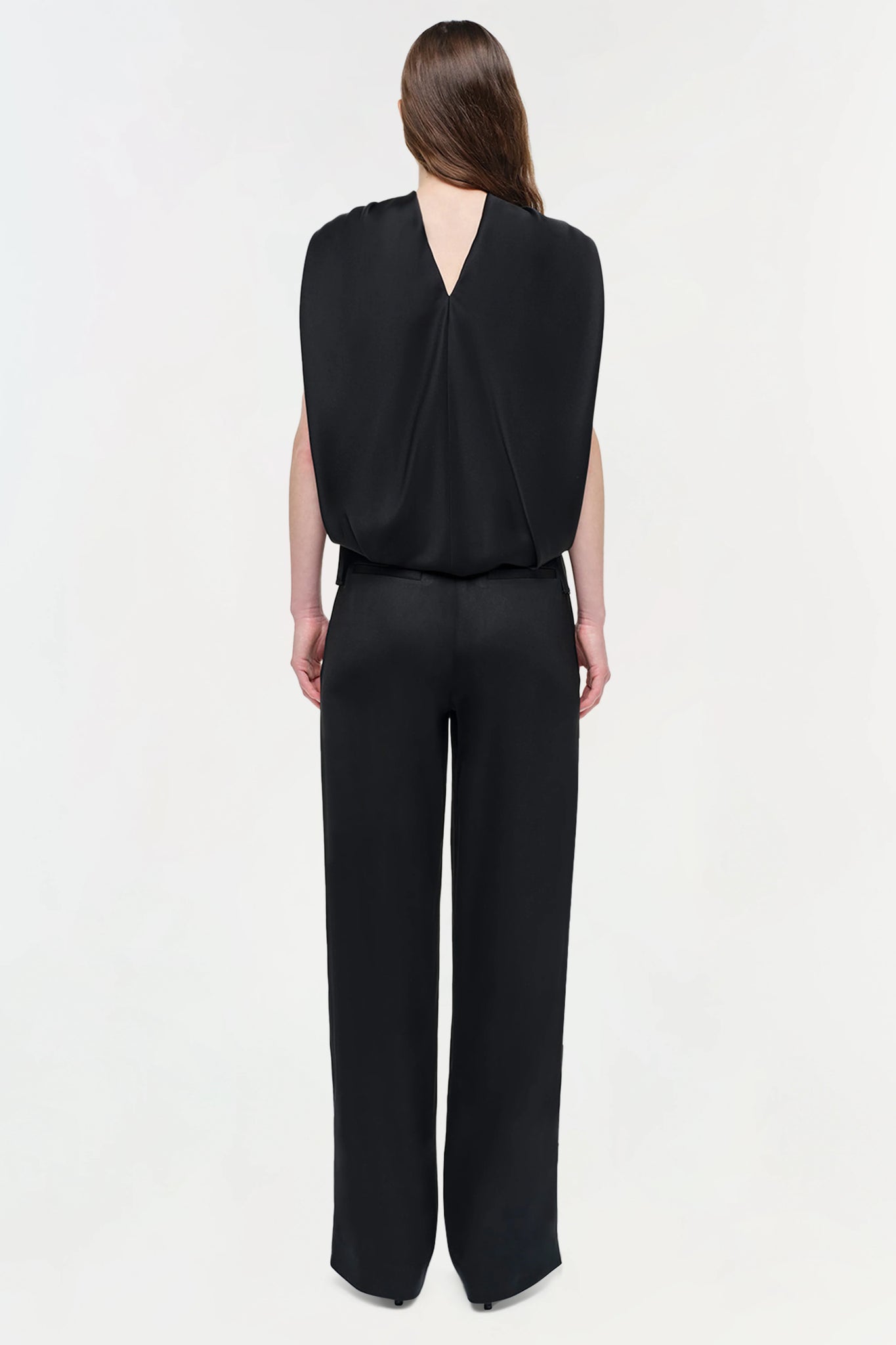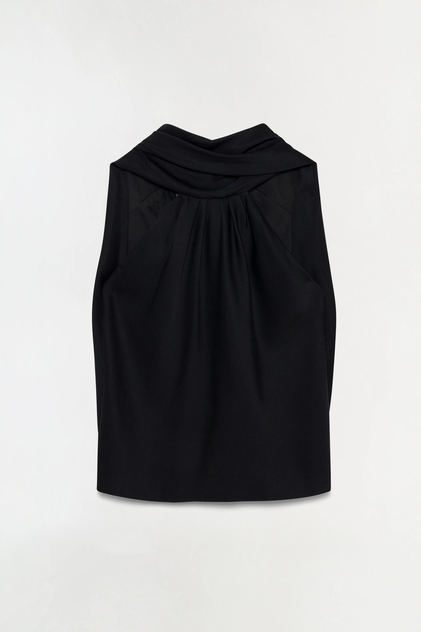 A draped satin cape top with a high neckline that gathers into controlled folds, releasing into a graceful back drape that falls with ease. Minimal yet striking, it captures the balance of movement and form.