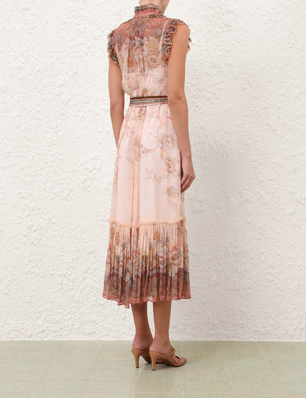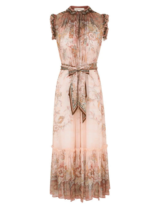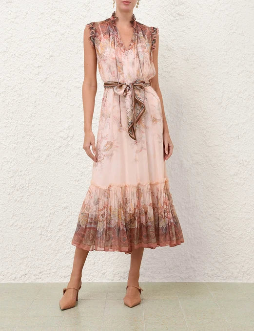 The Alchemy Flutter Dress in Pink Paisley from our Spring 2026 Collection, Kindred Spirit. A midi dress featuring a deep V-neckline with rouleau tie, removable scarf belt, finished with heavy gathering and frills throughout.