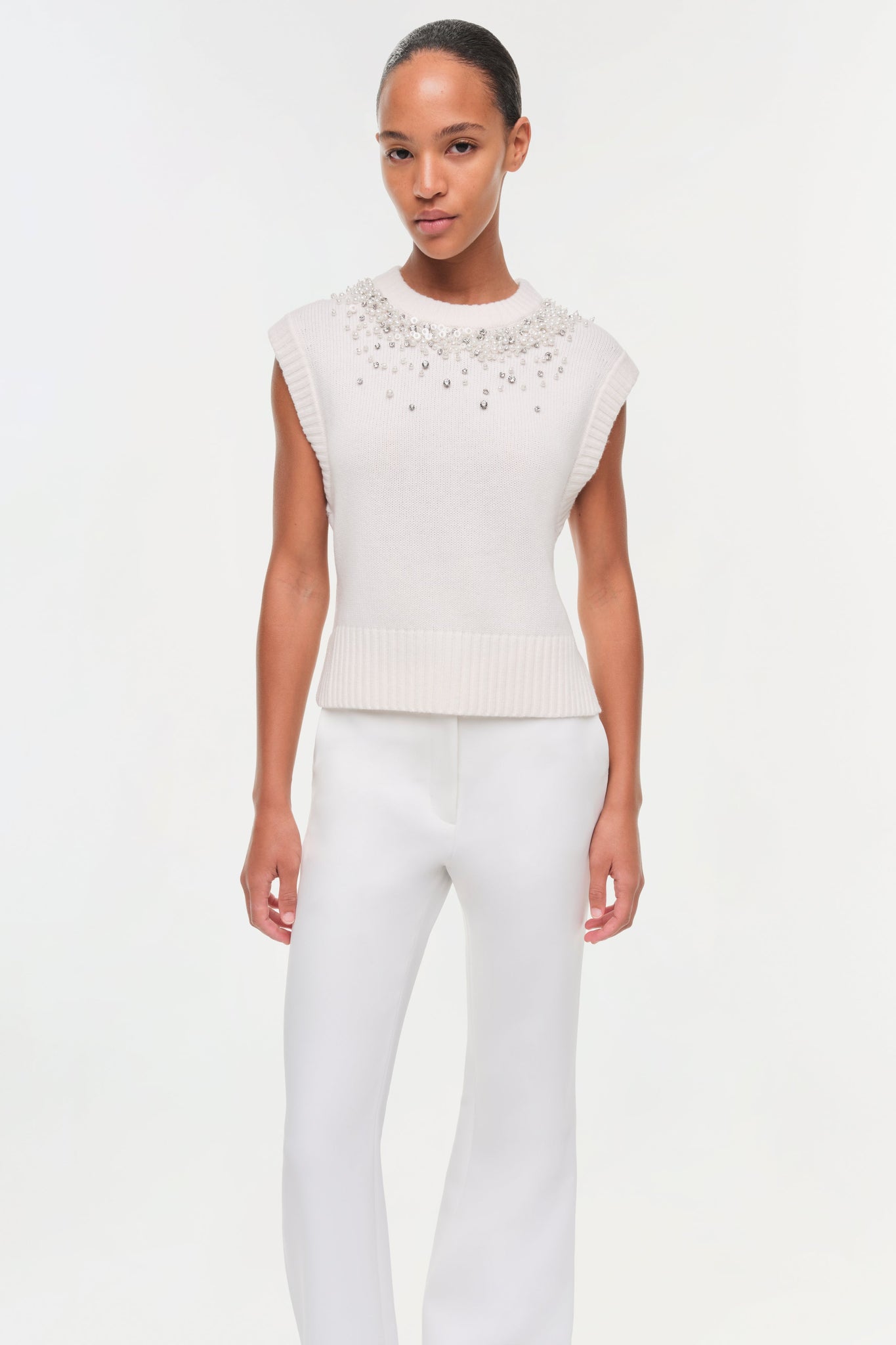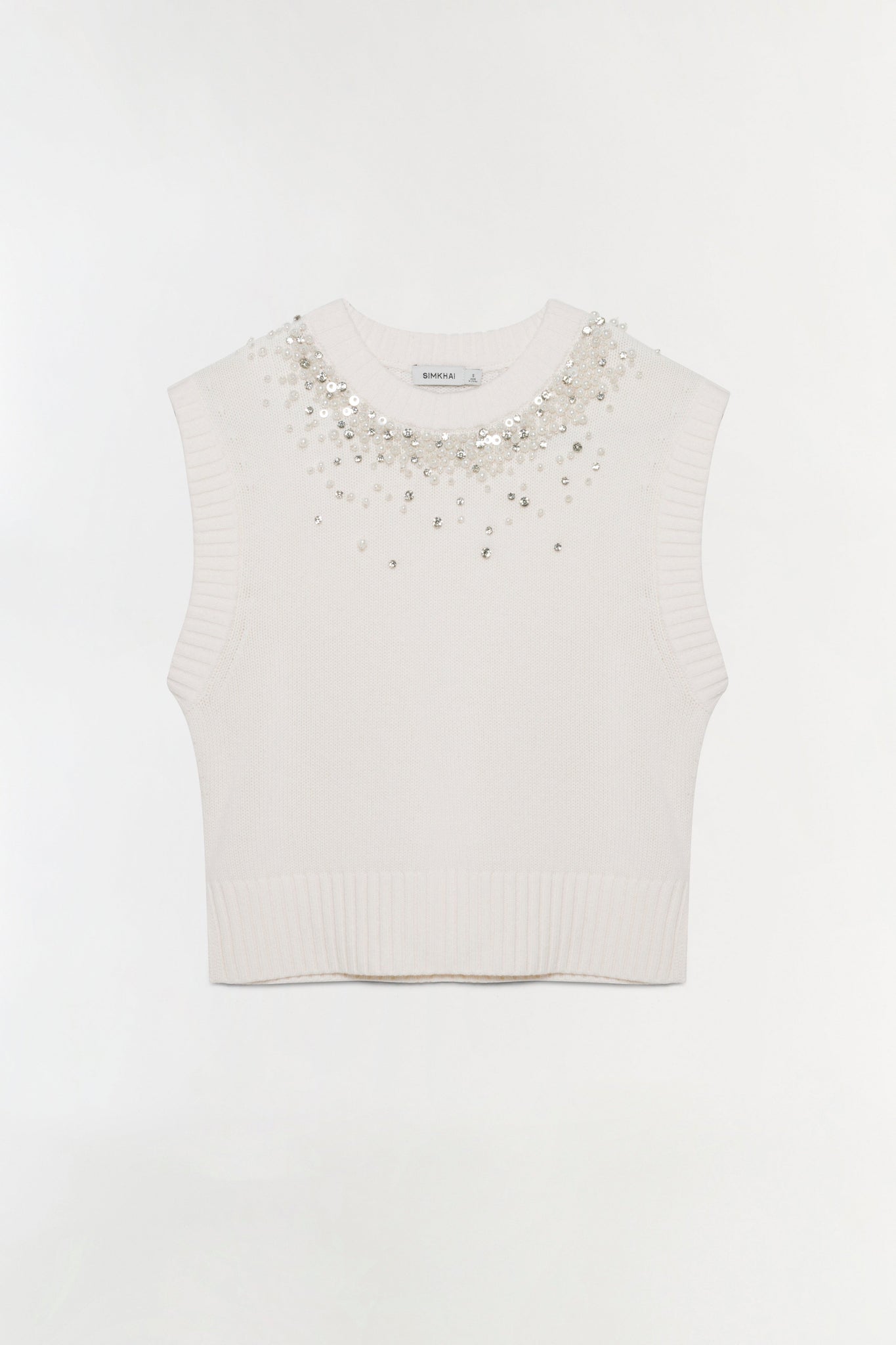 Knit from a soft wool cashmere blend, this sleeveless vest is structured with rib trims for shape. The neckline is hand-embellished with crystals and pearls, creating a luminous collar. A modern knit elevated with artisanal detail.
