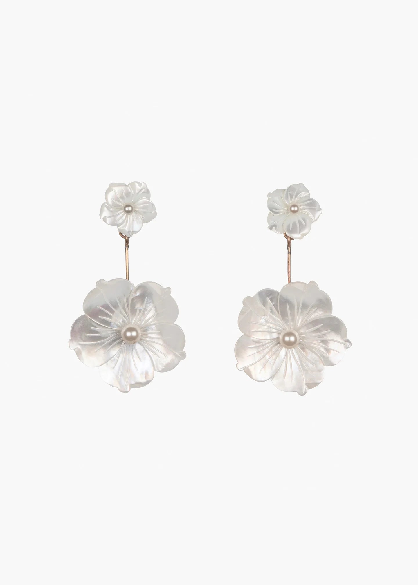 It's highly possible that we just made the perfect earring. The Zinnia Earring is a handmade, elegant drop, consisting of two intricately carved mother of pearl flowers, with a smaller pearl center. We love mother of pearl for its magical iridescence, which casts a flattering glow on everything it encounters. Dimensions: Weight: 6g each